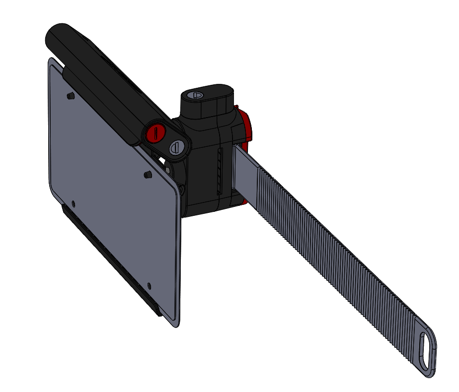 I created a ratcheting mechanism around a locking core that allows the user to easily attach the holder onto something as small as a bike tube, and as large as a bike rack frame. To attach to such a wide range of tube sizes, the ratchet strap is able to pivot around a dowel pin which ensures a snug fit no matter what size tube. Once attached to a tube, the license plate portion of the holder can rotate and tilt thanks to a ball joint mechanism that I included in the design, which gets tightened down via a thumb screw. The license plate is also secured in the holder via a locking core that rotates the top housing over the license plate so that the license plate can easily be secured and removed from the holder. Because the license plate must be illuminated, I worked with electrical engineers to spec out the location for a PCB board and create a housing that encapsulates 4 AA batteries. The PCB board allows the batteries to last longer as it is controlled by a light sensor that only turns the LEDs on when it is dark out. The PCB board is protected from the elements via a gasket seal around the main housing.